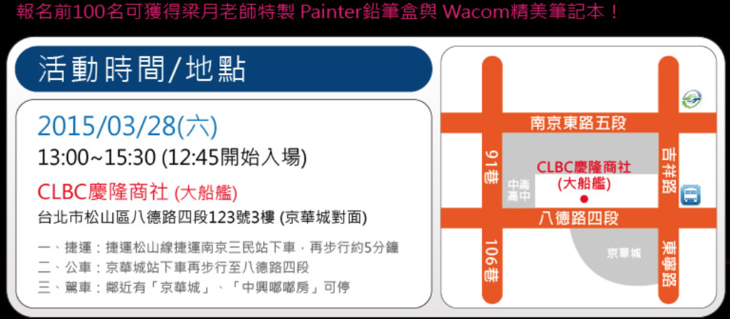 13 三月 3/28 遇見•梁月分享會( Paniter + Wacom ) 3/28 遇見•梁月分享會 報名網址: http://channelmis.weblink.com.tw/weblink2/action/regCorel1503.do 活動地點與時間: 活動流程表: