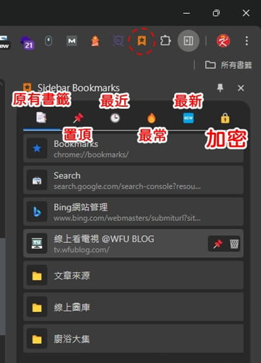 Chrome、Edge瀏覽器都有這款擴充功能可以安裝,使用 Chrome瀏覽器當作範例,安裝好「側邊書籤欄」擴充功能,從工具列就能找到「側邊書籤欄」功能鍵,按下後 Chrome、Edge瀏覽器的右側欄位就會顯示 Sidebar Bookmarks,「側邊書籤欄」等於可以替代 Chrome、Edge瀏覽器原本的書籤功能,從這邊整理、規劃書籤內容會比較清楚,更容易第一時間找到我們要的書籤內容。
