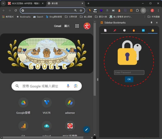 當有人借我們電腦開啟 Chrome、Edge 時,Sidebar Bookmarks 加密書籤的選項就會這樣顯示,除非有密碼,別人是沒辦法隨意看到我們加密中的書籤內容。