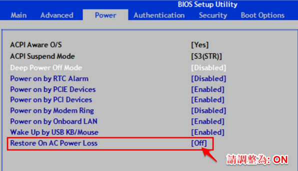 開機按下F2 進入Bios 設定『Power』→『Restore On AC Power Less』