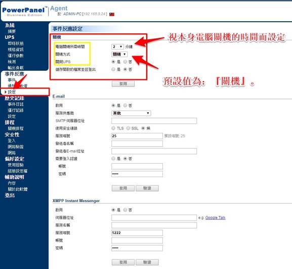在這裡我們可以依照各種不斷電系統下的電腦關機所需的時間來調整。