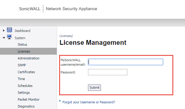 - 在System>License輸入mysonicwall帳號,如下圖: