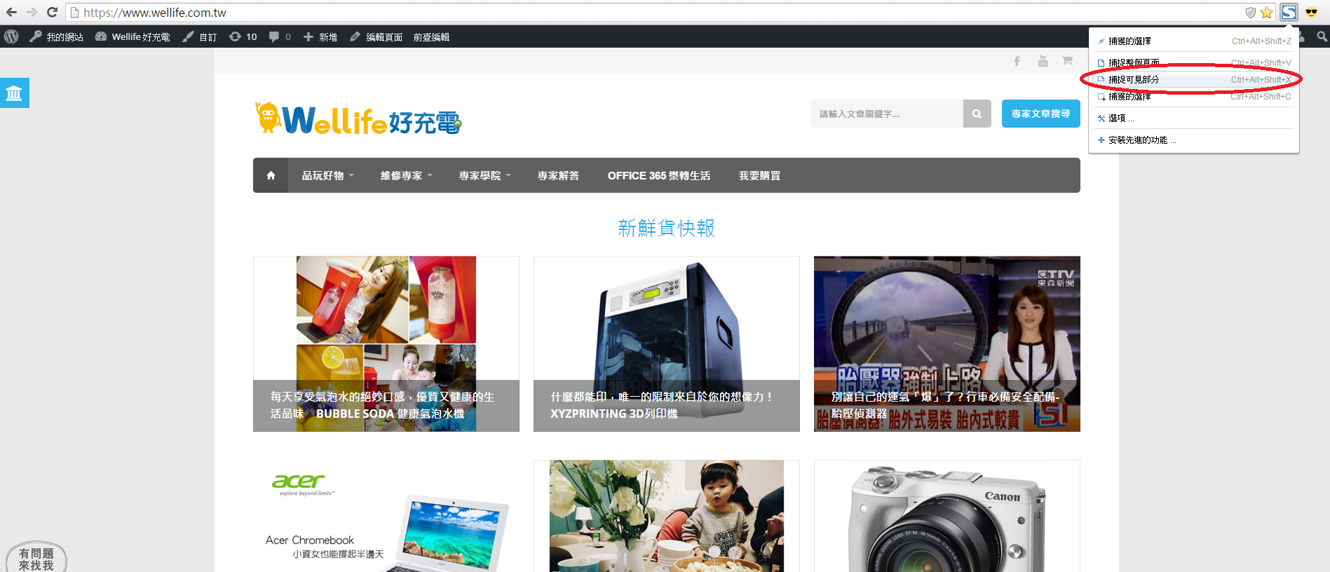 第二種模式是:捕捉可見部分,顧名思義就是快速擷取你目前所看到的畫面,等同於你螢幕所看到的等比畫面。