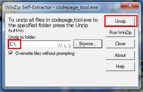 2. 執行上個步驟下載的檔案,建議將解壓縮的路徑改為「C:\」,然後按「Unzip」。