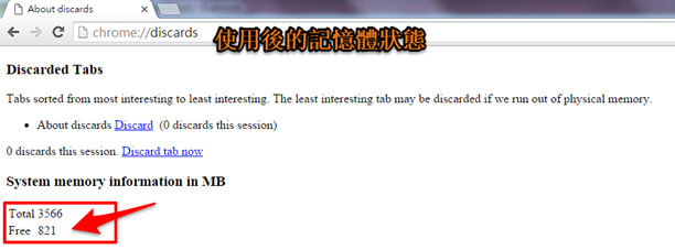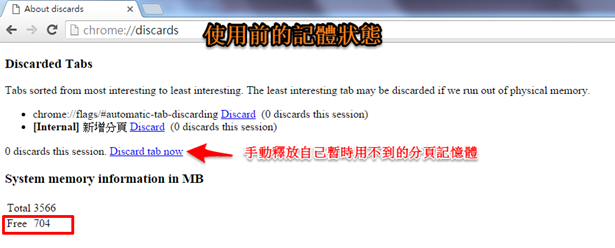在這裡你會看到 Chrome 即時統計目前的記憶體剩餘量,以及它決定自動釋放哪些分頁。